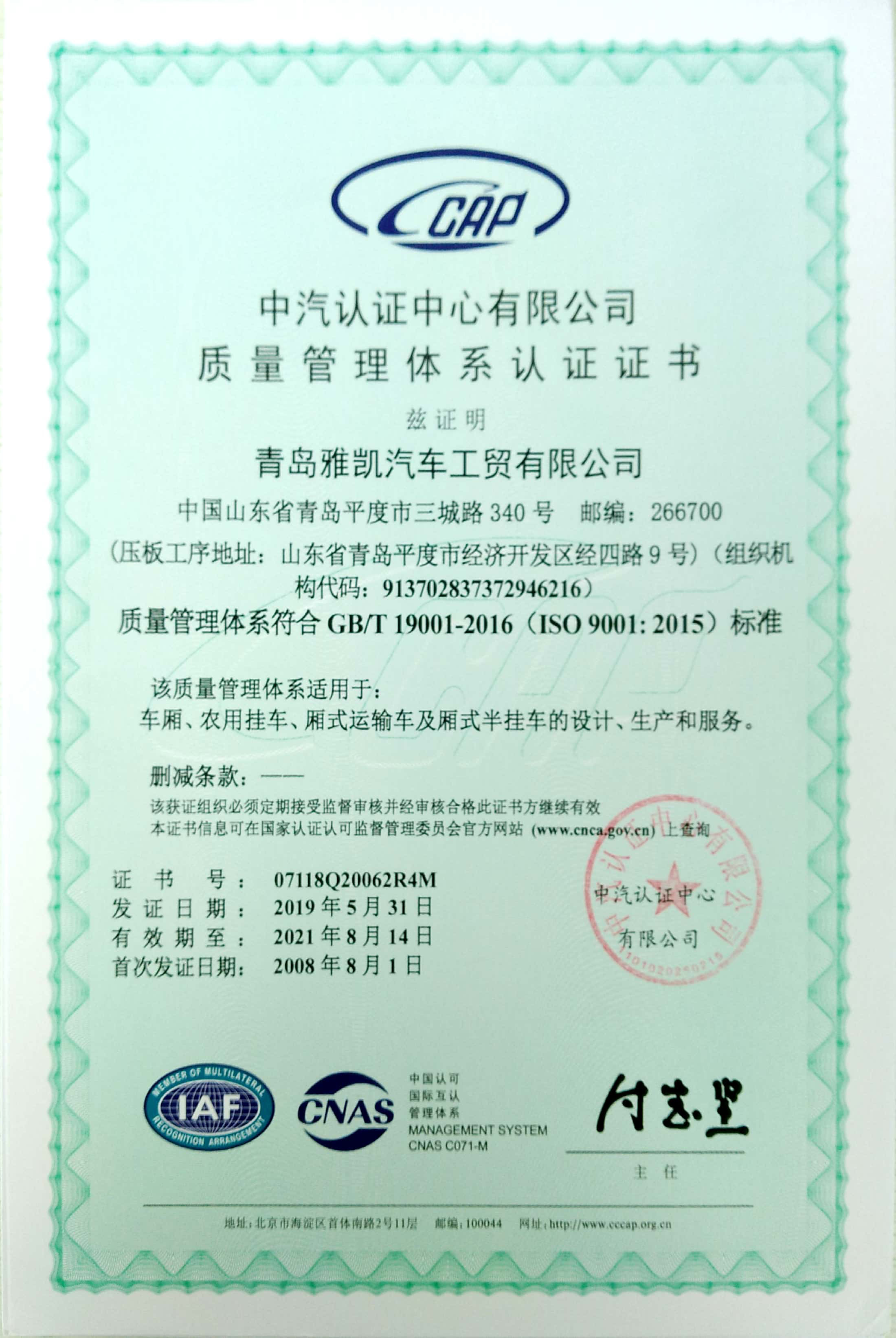 青島雅凱汽車工貿(mào)有限公司(以下簡(jiǎn)稱青島雅凱),是國(guó)家工業(yè)和信息化部批準(zhǔn)生產(chǎn)的高新技術(shù)企業(yè),為此公司特創(chuàng)立“冰凌方”品牌,并在市場(chǎng)上占有了相當(dāng)?shù)姆蓊~。青島雅凱是中國(guó)北方地區(qū)生產(chǎn)各類專用車的骨干企業(yè),是冷藏車、保溫車、半掛冷藏車、雞苗車、散裝飼料車等專用車科研開(kāi)發(fā)和生產(chǎn)基地,年產(chǎn)量5000余臺(tái)。公司已通過(guò)ISO9001:2008國(guó)際質(zhì)量體系認(rèn)證和國(guó)家強(qiáng)制性產(chǎn)品認(rèn)證(“CCC認(rèn)證”).