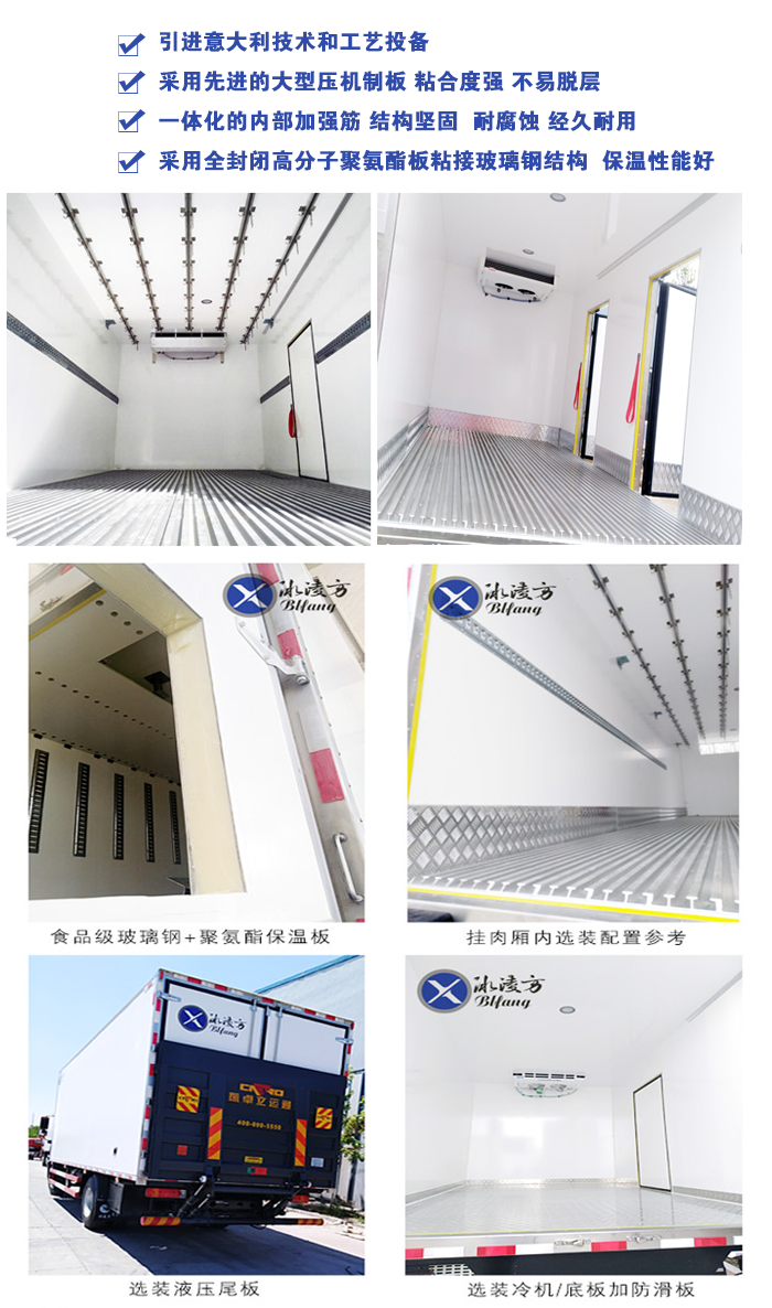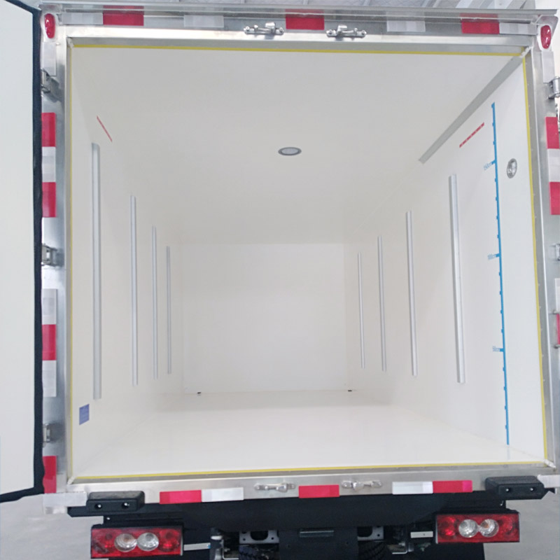 冰凌方冷藏車采用全封閉聚氨酯板塊粘接玻璃鋼結構,廂體比同類產品輕,能有效的降低運輸成本。廂體采用高分子聚酯材料熱壓成型,采用全封閉結構。一體化的內部加強筋,極大的增加了廂板強度,高強度、高密封性膠合劑,形成一個整體,耐腐蝕性好。采用“三明治”壓法,保證廂板內無空氣間隙,廂體無金屬冷橋,導熱率低。